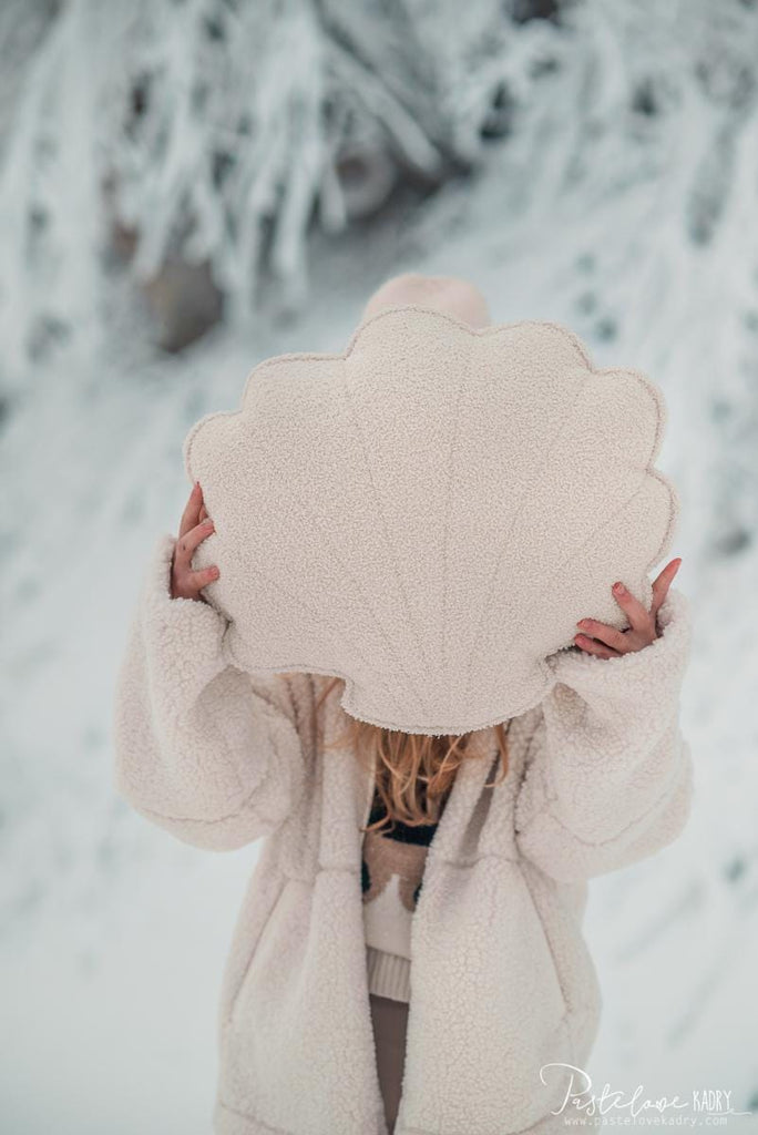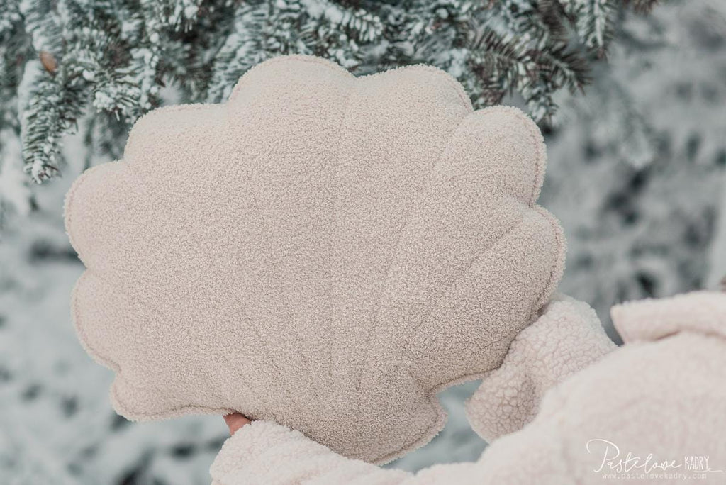 Fluffy Boucle shell pillow "white teddy", Minimalist Cushion for living room, Modern bedroom pillows, Exclusive pillows for costal home