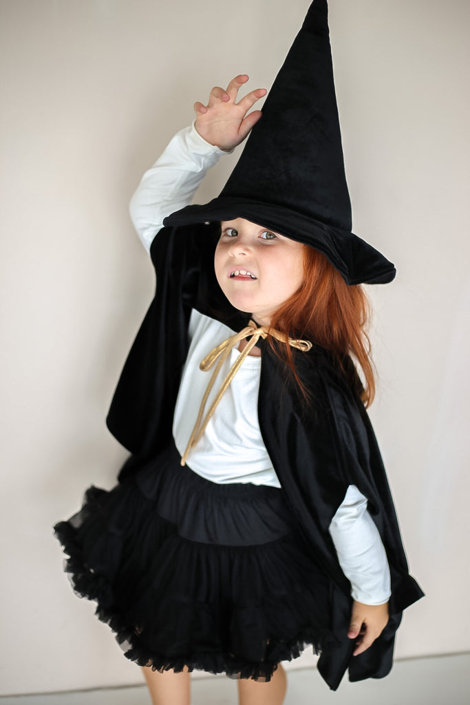 The hat is made of soft velvet. Made in the classic witch style, with a characteristic pointed tip and a wide brim. This way, your child will look like a real witch or wizard, ready for divination and spells!