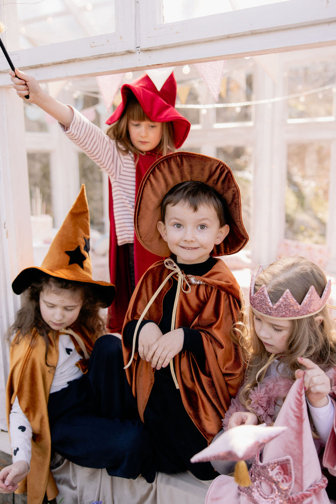 The hat is made of soft velvet. Made in the classic witch style, with a characteristic pointed tip and a wide brim. This way, your child will look like a real witch or wizard, ready for divination and spells!