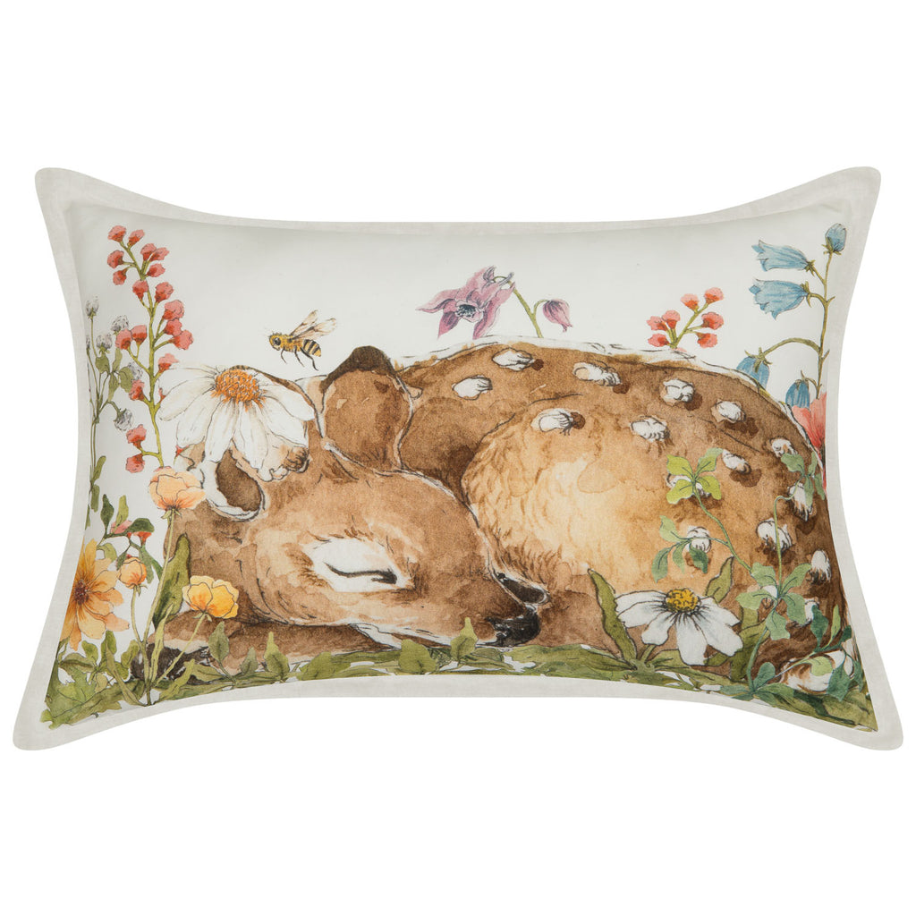 Un coussin avec un beau motif floral et biche sur fond blanc qui s'adapte à la plupart des styles de décoration. Il est soigneusement fabriqué en tissu de coton de haute qualité.