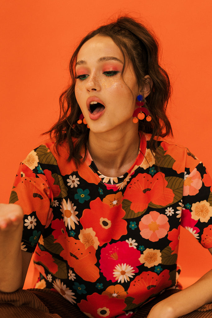 Cette chemise en tricot de haute qualité, avec un fond noir et de belles fleurs d'été, vous fera vous sentir comme si vous étiez au milieu d'une prairie d'été ou en camping . Convient à toutes les occasions.