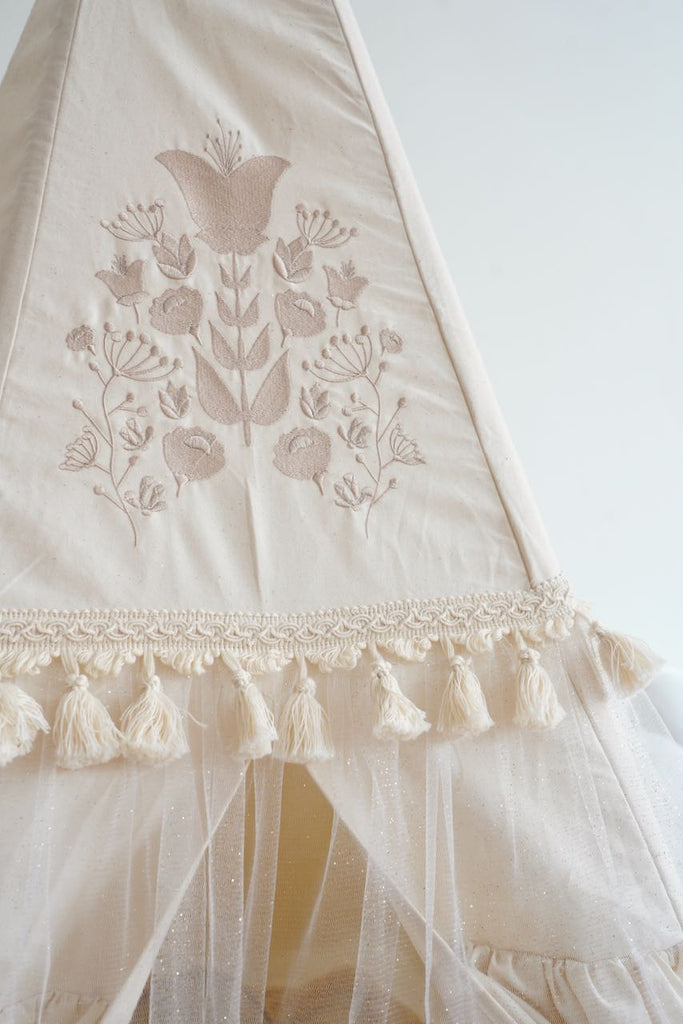 Tältet med krusiduller är robust tillverkat av tjock krämfärgad bomull. Tack vare sin femväggsstruktur är tältet stabilt när det sätts upp. Stolparna är rundade och placerade i tunnlar som sys ihop i botten.
