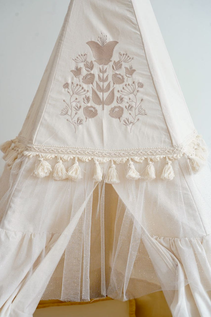 Bekväm, avslappnad, avslappnad. Din lilla äventyrare kan tillbringa långa timmar med att utforska världen och leka, men när han kommer tillbaka behöver han eller hon en plats att vila, äta och planera för ytterligare äventyr. En tipi betyder bokstavligen en bostad och är ett ord som används av siouxerna, ursprungsbefolkningen på Great Plains. Det är ett utrymme för alla typer av kul.