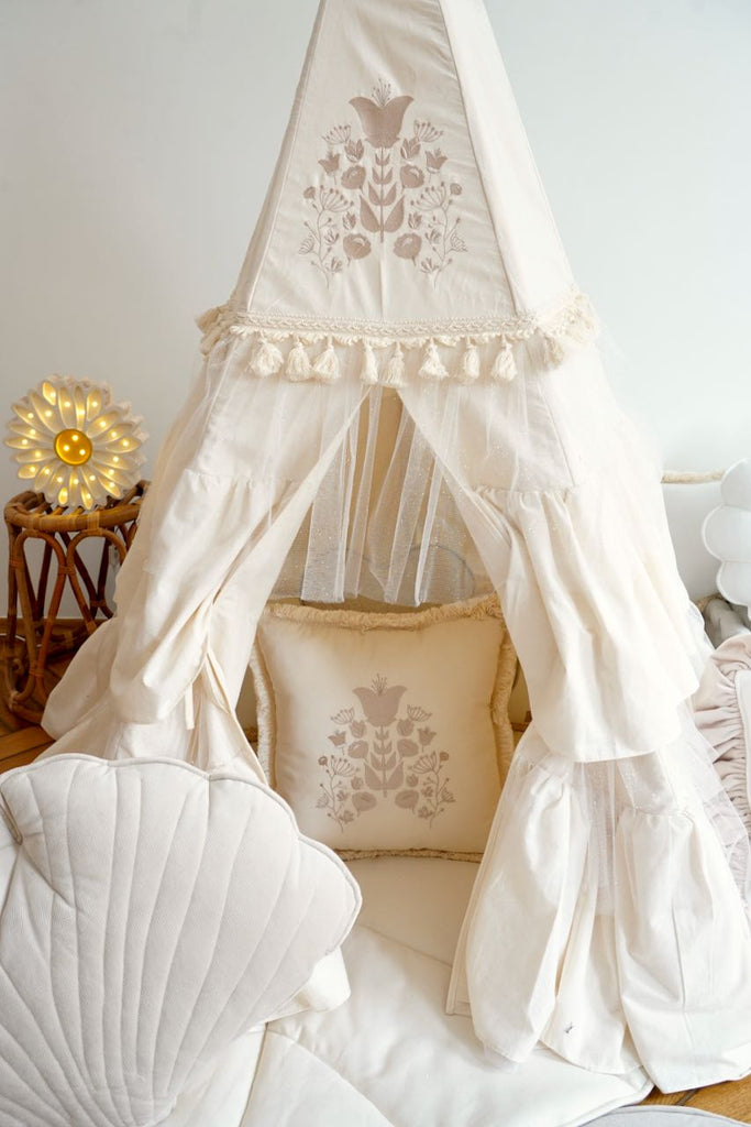 Setet innehåller ett lektält, matta, stolpar och ett bomullsöverdrag. Komplettera den gärna med våra vackra dekorationer och tillbehör.