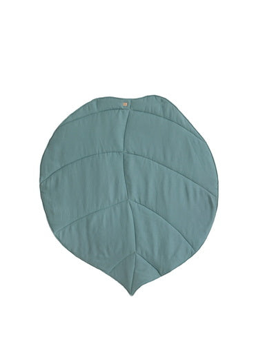 En mjuk bladformad matta i bomull och linne i blågrön färg. Den fungerar perfekt som en liten matta vid barnets säng, lekmatta för bebisen eller som en del av tipi-setet.